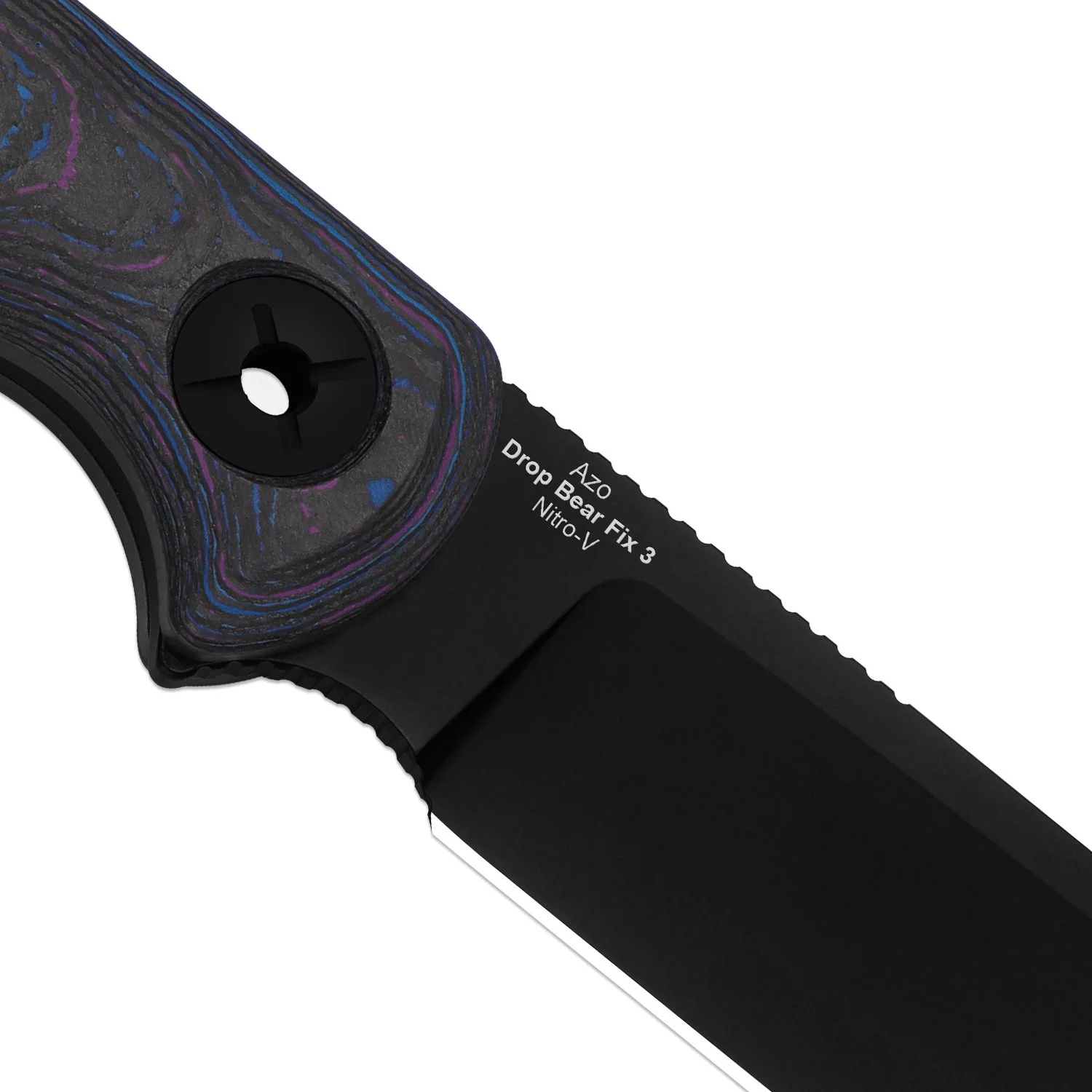 This fixed blade has been months in the making. It’s the FIRST and ONLY Drop Bear Fix 3 ever produced with a Nitro‑V blade — and the first to feature Camo Carbon scales. For this exclusive run, we paired it with Damtanium for a wild mix of color and the perfect amount of UV-reactive pop. Even the box carries a matching Damtanium print.